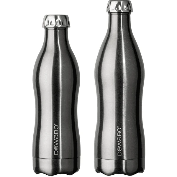Mit ihren dynamischen Kurven und dem coolen Verschluss-Design passt sie perfekt in Kinder- und Erwachsenenhände und bietet ein angenehmes Trinkgefühl.• Für kohlensäurehaltige Getränke geeignet.• Hält Getränke bis zu 24 Stunden lang kalt und bis zu 12 Stunden lang heiß.• Der praktische Bottlebag schützt die Flasche vor Kratzern.• Unterstützt das Projekt “PAUL”* der Universität Kassel.*Portable Aqua Unit for Lifesaving (Wasserrucksack): Projekt “PAUL” des Fachgebiets Siedlungswasserwirtschaft der Universität Kassel.WICHTIGER HINWEIS:Nicht in die Mikrowelle oder in den Gefrierschrank stellen.Bei heißen Getränken besteht Verbrühungsgefahr. Vor dem ersten Gebrauch gründlich reinigen.Vakuumisoliert, so dass sich kein Kondenswasser außen an der Flasche bildet. Da es sich um eine lackierte Oberfläche handelt nicht mit scharfen/spitzen Gegenständen in Berührung bringen bzw. den im Lieferumfang enthaltenen Bottlebag benutzen.Lieferumfang: DOWABO Trinkflasche, Bottle Bag, Ersatzdichtung, Anleitung´Materialhinweise: • Deine DOWABO® besteht aus einem leichten, doppelwandigen Edelstahlkörper und ist dadurch extrem stoßfest und robust.• Vakuumisoliert, so dass sich kein Kondenswasser außen an der Flasche bildet.• Da es sich um eine lackierte Oberfläche handelt nicht mit scharfen/ spitzen Gegenständen in Berührung bringen bzw. den im Lieferumfang enthaltenen Bottlebag benutzen.Gewicht:350 ml: ca. 320 g500 ml: ca. 365 g750 ml: ca. 485 gMaße:350 ml: ca. 21 cm hoch, ø ca. 8 cm500 ml: ca. 26 cm hoch, ø ca. 8 cm750 ml: ca. 30 cm hoch, ø ca. 9 cm