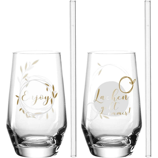 LEONARDO Set 2 Trinkgläser + 2 Glastrinkhalme mit Motiv “Enjoy” PRESENTE im Geschenkkarton Das edle Trinkglas aus der Serie PRESENTE sorgt für wahre Genussmomente. Dieses geometrisch geformte Trinkglas ist ein absolutes Must-Have. Es überzeugt mit einem schönen Aufdruck. Mit einem guten Gespür für die schönen Dinge bringt LEONARDO noch mehr Abwechslung in Ihr tägliches Leben. Dieses Trinkglas ist spülmaschinengeeignet. Dank erhöhter Oberflächenhärte sind Teqton Produkte besonders langlebig und kratzfest. Dadurch erhalten sie eine dauerhafte Brillanz und Transparenz. Das Set besteht aus 2 Trinkgläsern mit 2 Glastrinkhalmen. Da sollten Sie nicht mehr lange warten! Kommen auch Sie in den Genuss dieses wunderschönen Trinkglases! Auch als Geschenk eine ausgezeichnete Wahl! Artikeldetails: Trinkgläser: Durchmesser: ca. 6,0 cm Höhe: ca. 13,0 cm Inhalt: ca. 300 ml Nutzvolumen (ca. 365 ml Randvollvolumen) Trinkhalm: Durchmesser: ca. 0,9 cm Länge: ca. 20,0 cm Lieferungsumfang: 2 Gläser, 2 Trinkhalme